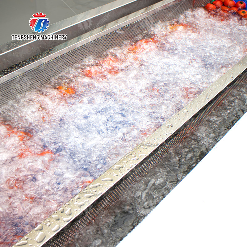 Princípio de funcionamento: A máquina da limpeza da bolha usa o gás de alta pressão para gerar a borbulhagem, a bomba de água da circulação surfando e levantando a limpeza de alta pressão triplicar-se do pulverizador de água. Pode eficazmente separar o sedimento e as impurezas nos vegetais. O volume da fonte de água no processo de pulverização de alta pressão é ajustável, que é conveniente para que os clientes ajustem flexivelmente de acordo com o volume e a limpeza vegetais.